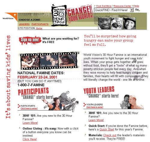 30 Hour Famine funds provide emergency relief, as well as long-term assistance to help people overcome widespread poverty overseas and in the United States. Donations also support World Vision Christian whitness projects around the world.