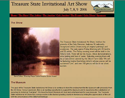 The Treasure State Invitational Art Show, held on the grounds of the Daly Mansion, features 68 nationally recognized artists showcasing all original paintings and sculpture. 2006/Summer